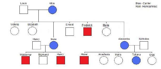 - Frederick (her brother) was hemophilic. He received a recessive allele from Alice, but this does not say anything about Irene´s genotype.