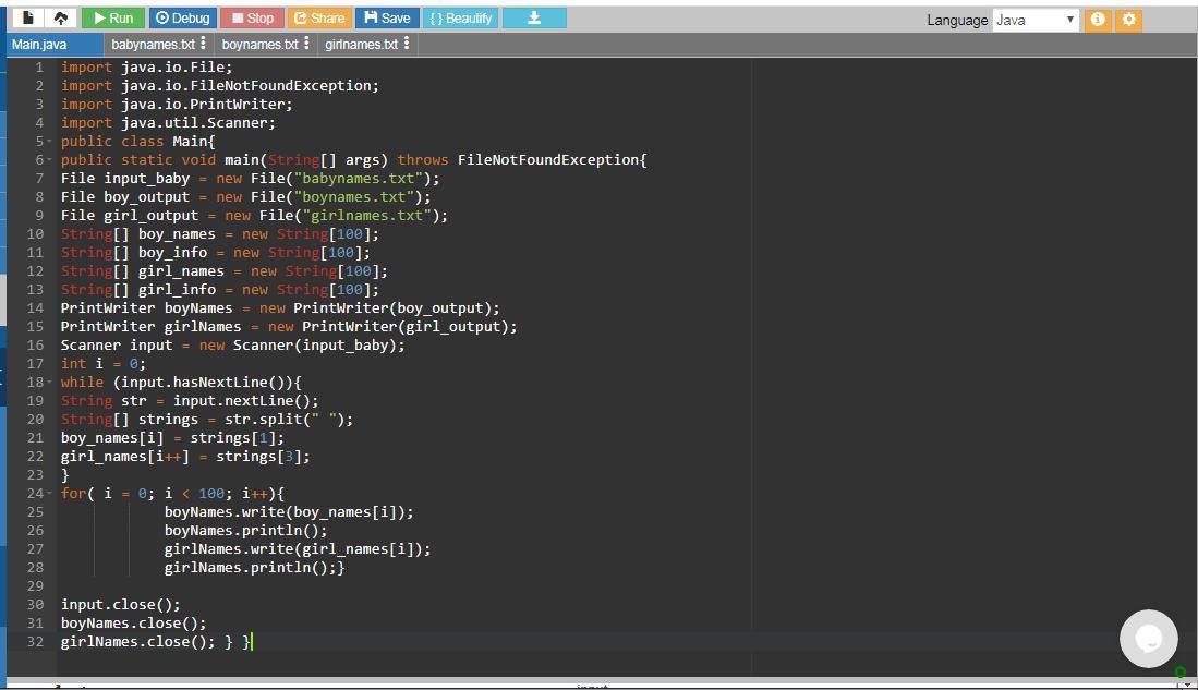 The program has an input file babynames.txt and two text files to store separated boys and girls names. The while loop reads every line of the babynames.txt at each iteration and and splits each line into array of words strings based on the space delimiter. A line from babynames.txt file: 1 Michael 65,275 Jessica 46,470