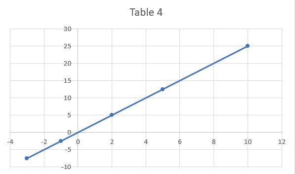 A table with 6 columns and 2 rows. The first row, x, has entries, negative 3, negative 1, 2, 5, 10. The second row, y, has entries, negative 7.5, negative 2.5, 5.0, 12.5, 25