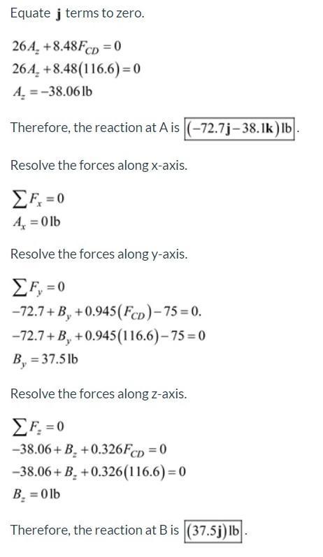 (b) The reaction at A is (-72.7j-38.1k) lb and at B it is (37.5j) lb.
