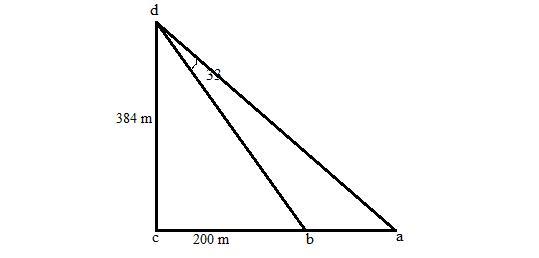 the balloon, and the others look at it at certain angles. in the following image, a,b, and c are people, and d is the balloon. person c is 384m directly below the balloon, person b is 200m away from person c, and the angle between person a, the balloon, and person b is 33 degrees. how far is person a from the hot air balloon