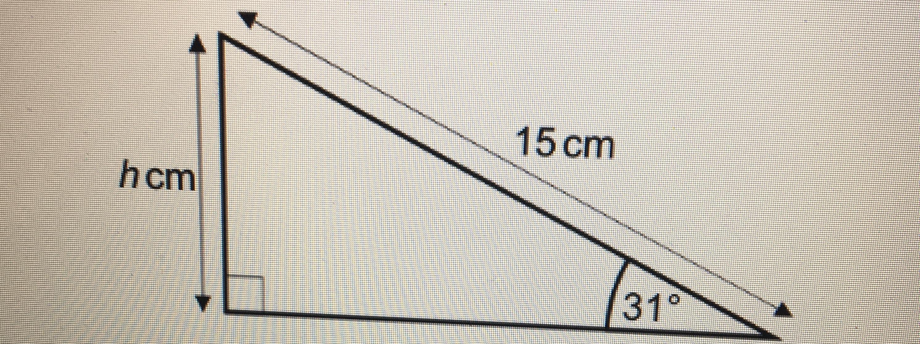 <em>or</em><em>,</em><em> </em><em>0</em><em>.</em><em>5</em><em>1</em><em>5</em><em>0</em><em>3</em><em>8</em><em>×</em><em>1</em><em>5</em><em>=</em><em>h</em><em> </em><em> </em><em> </em><em> </em><em> </em><em> </em><em>(</em><em>using</em><em> </em><em>calculator</em><em> </em><em>sin</em><em> </em><em>3</em><em>1</em><em>°</em><em>=</em><em>0</em><em>.</em><em>5</em><em>1</em><em>5</em><em>0</em><em>3</em><em>8</em><em>.</em><em>)</em>