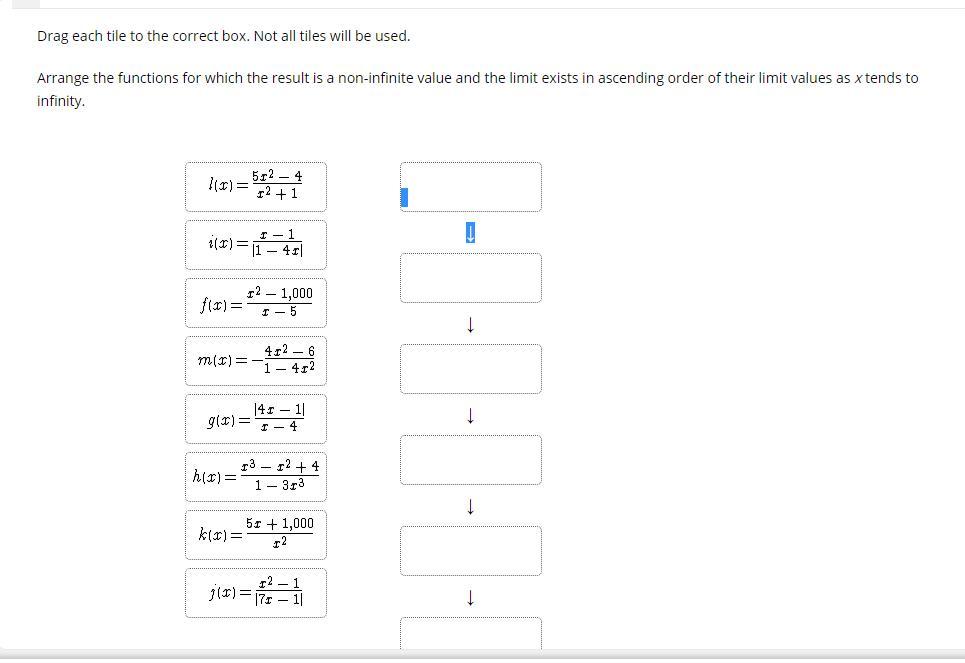 The arrangement of the functions for which the result is a non-infinite value and the limit exists in ascending order of their limit values as x tends to infinity is given below;