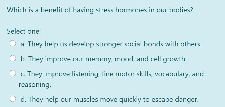 PLS ANSWER QUICKLY!!! Which is a benefit of having stress hormones in our bodies? Select one: a. They help us develop stronger s