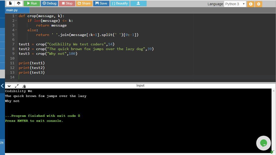 def crop(message, k): #function definition which takes a message string and a limit k as parameter