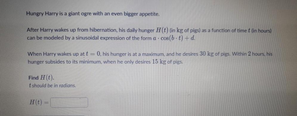 ft parenthesis, t, right parenthesis (in \text{kg}kgstart text, k, g, end text of pigs) as a function of time ttt (in hours) can be modeled by a sinusoidal expression of the form a\cdot\cos(b\cdot t)+da⋅cos(b⋅t)+da, dot, cosine, left parenthesis, b, dot, t, right parenthesis, plus, d. When Harry wakes up at t=0t=0t, equals, 0, his hunger is at a maximum, and he desires 30 \text{ kg}30 kg30, start text, space, k, g, end text of pigs. Within 222 hours, his hunger subsides to its minimum, when he only desires 15 \text{ kg}15 kg15, start text, space, k, g, end text of pigs. Find H(t)H(t)H, left parenthesis, t, right parenthesis. \textit{t}tstart text, t, end text should be in radians.