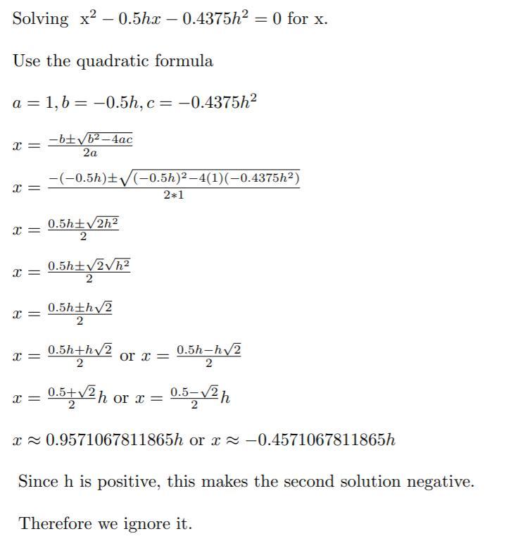 From here you use the quadratic formula to get x = 0.9571067811865h approximately (the other solution is ignored as it's negative). See the attached image below if you're curious what the quadratic formula steps would look like.