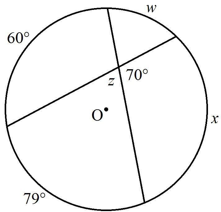 The full 360 degree circle has the arc measures of 60, 79, x = 80, and w, where we don't know w yet. But we can add the four pieces of the circle to get 360