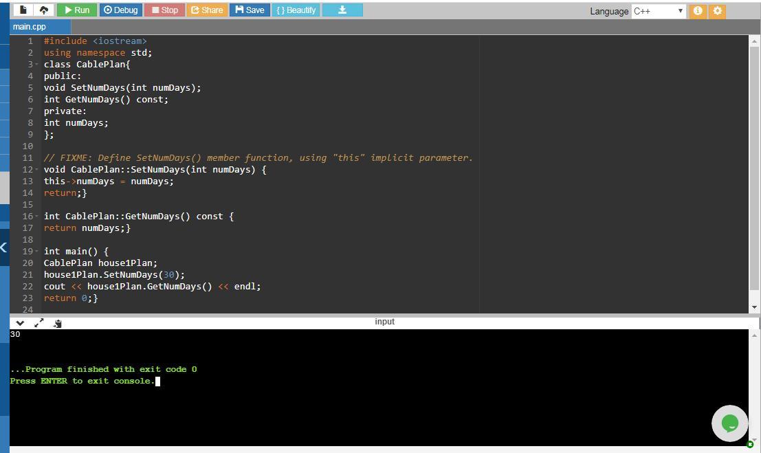 cout << house1Plan.GetNumDays() << endl; //uses object to call member function of CablePlan to get the no of days (numDays)