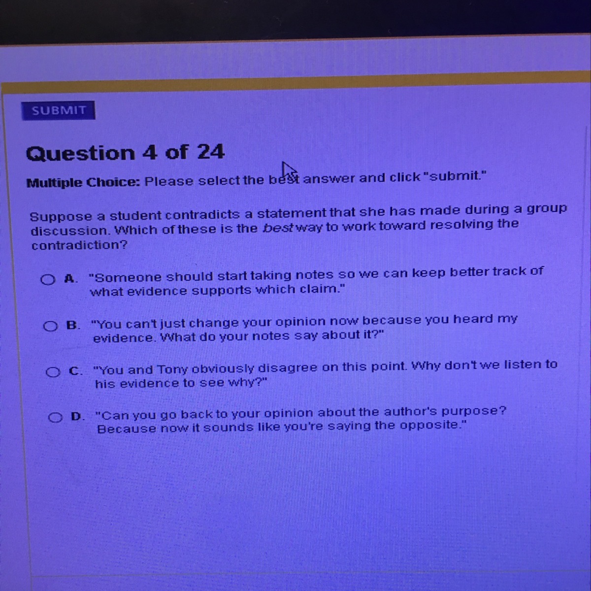 Explanation: The words "silly" and "stupid" are the only instances of evidence among the options, since they were taken directly from the text that is being discussed. The closest example of bringing the text's content into the discussion is in option C (stating what the author has expressed), but that option doesn't present any conclusion. Option A is presented as a personal opinion with a vague origin ("I feel") and option B tries to back the presented conclusion with an assumption ("the author obviously hates [...] fast food") instead of evidence.