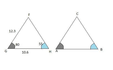 In triangle FGH, FG = 12.3 cm, GH = 10.6 cm, m angle G=80 degrees, and m angle H=55 degrees. If triangle ABC GHF, which statement is true?