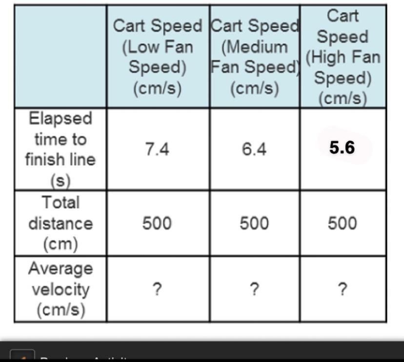 ed cm/s squared? what was the acceleration of the cart with high fan speed cm/s squared?