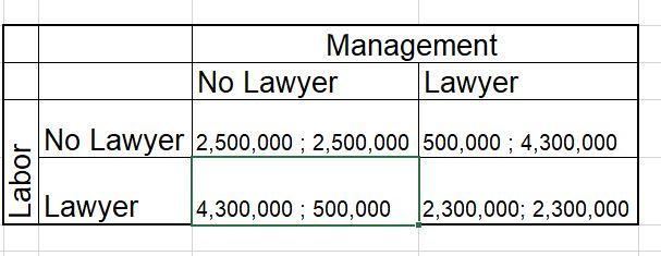 2. The Nash Equilibrium is the alternative that it would not serve either party to deviate from as it serves them both well. The Nash Equilibriums would be If both don't get a lawyer or if both get a lawyer.