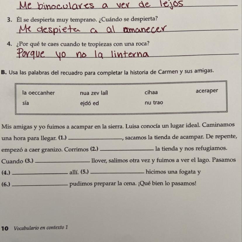 Mis amigas y yo fuimos acampar en la sierra. Luisa conocía un lugar ideal.    Caminamos una hora para llegar. Una vez ahí (nua zev íah), sacamos la tienda de acampar. De repente comenzó a caer granizo. Corrimos hacia (cihaa) la tienda y nos refugiamos. Cuando dejo de (ejdó ed) llover, salimos otra vez y fuimos a ver el lago. Pasamos un rato (nu trao) allí. Al anochecer (la oeccanher) hicimos una fogata y así (sía) pudimos preparar la cena. ¡Qué bien la pasamos!