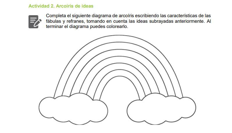 What you have to write on the rainbow are the important ideas from the text,  those that differentiate a <em>fábula </em>from a <em>refrán</em>.