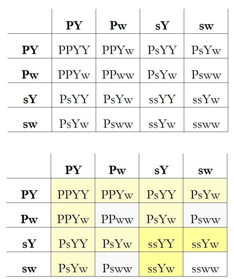 Our parent birds are dihybrid cross which involves 2 genes coding two traits, with dominant yellow pattern both represented by PPssYYww.