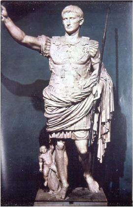Augustus is wearing military clothing, holding a consular baton (stick/staff). This symbolizes importance and leadership.