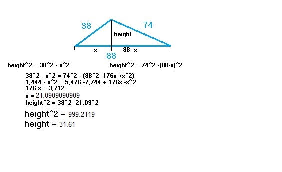 The lengths of the side of a triangle are 74 feet, 38 feet, and 88 feet. What is the length of the altitude drawn to the longest