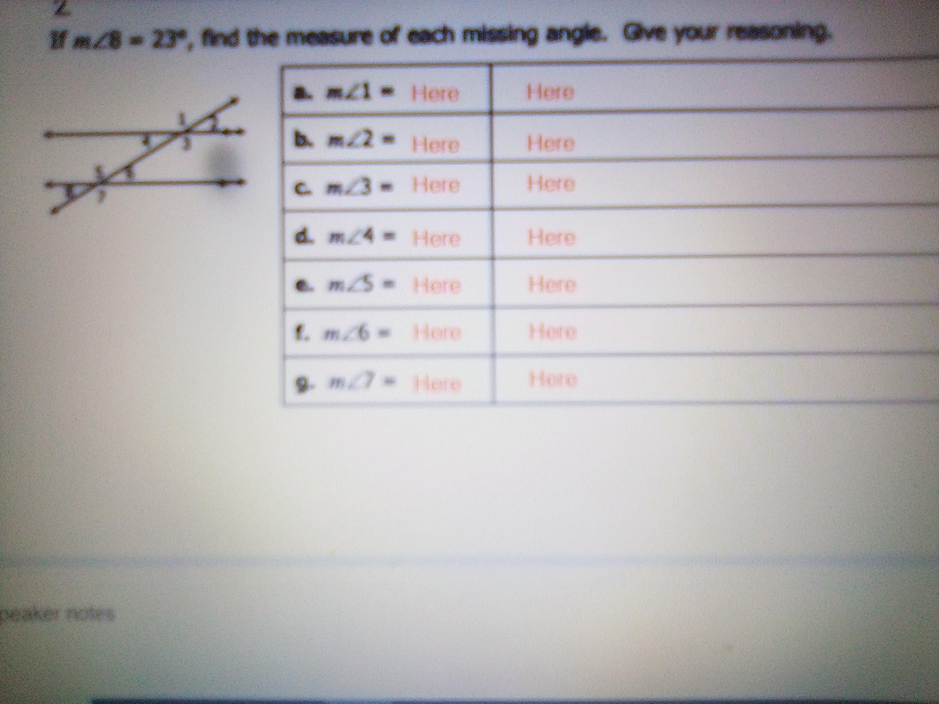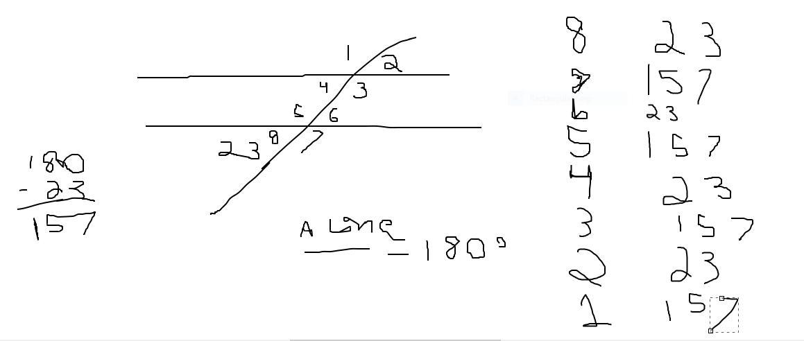 a straight line is 180 degrees. angle 8 is 23 degrees. we want to know the rest of the angles measures. 180-23=157. angles directly across the vertex are the same measure. and since the lines are parallel 2,4,6,and 8 all have the same measure and 1,3,5,and 7 have the same measure.