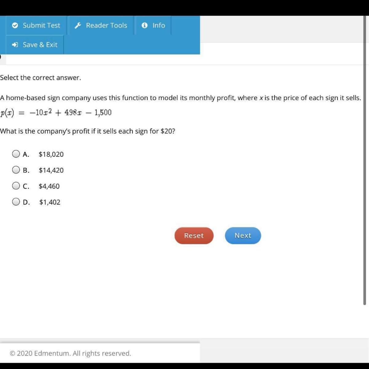 f(20) = -10(20)^2 + 498(20) - 1,500