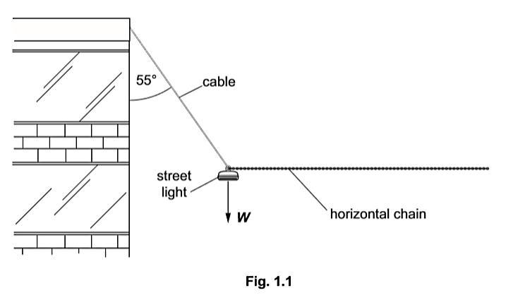 able is attached to the side of a tall building. The street light is pulled to one side by a horizontal chain and held stationary above the road. Fig. 1.1 shows the cable at 55° to the vertical. The tension in the cable is 43.6 N. a) A force of size W is produced by adding the tension in the horizontal chain and the tension in the cable as vectors. i) State the direction of the vector sum of these two forces. ii) In the space below, draw to scale a vector diagram to determine . State the scale used. Scale used: …………………………… W = ……………………………. iii) Calculate the mass of the street light. mass = …………………. kg