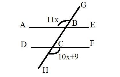 line AE and line DF are parallel. If m∠ABG = 11x and m∠HCF = 10x + 9, what is m∠ABG? points B and C are on line GH between point