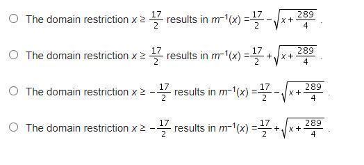 The \ domain \ restriction \ x \geq \dfrac{17}{2} \ results \ in \ m^{-1}(x) = \dfrac{17}{2} \pm \sqrt{x + \dfrac{289}{4} }}