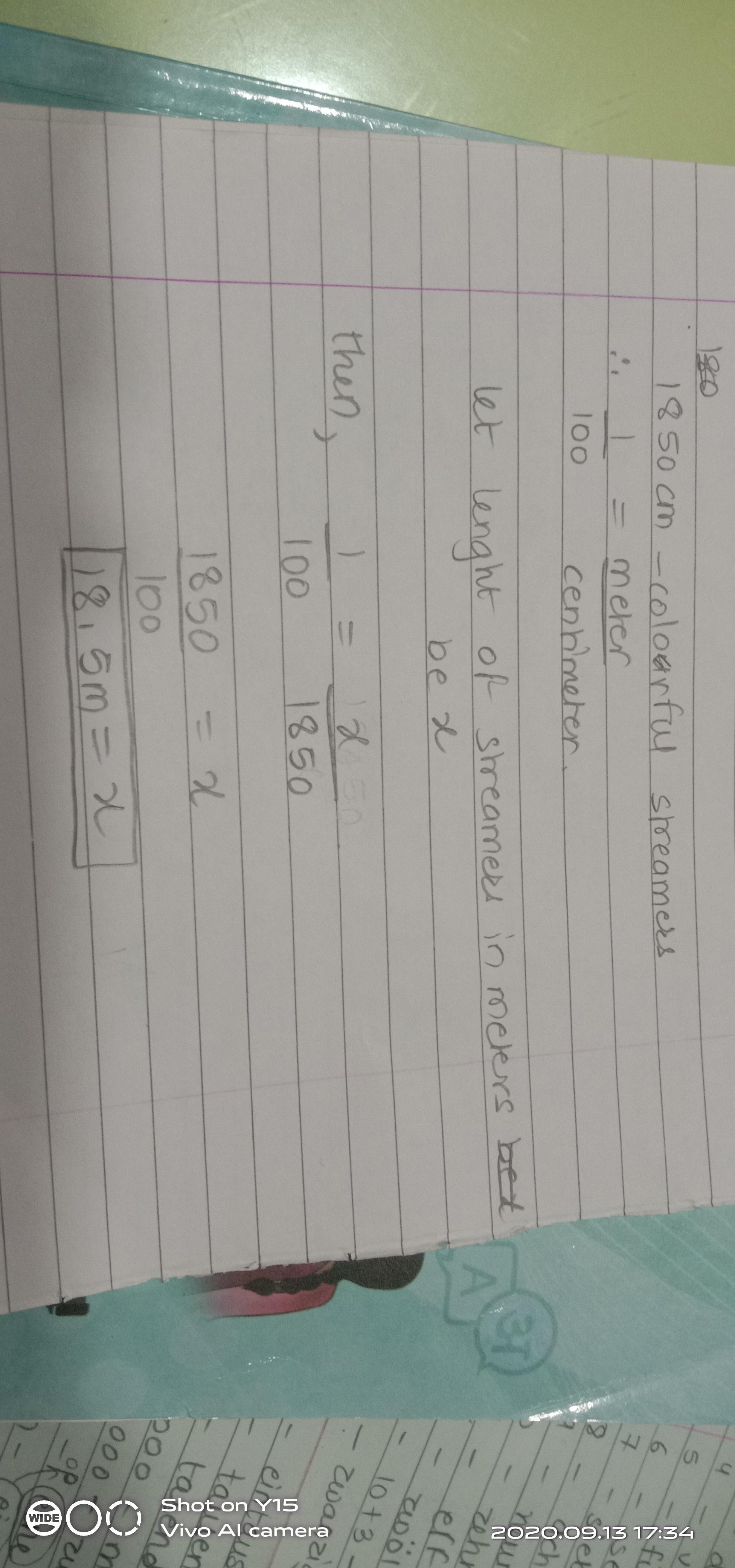 To decorate for a party, Simon needs 1,850 centimeters of colorful streamers. If the ratio of meters to centimeters is 1 : 100,