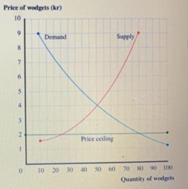 a. At the price ceiling of 2 kroner per widget, suppliers on the graph are only willing to supply 25 widgets yet the demand at that point is 80 widgets.