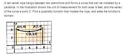 A red velvet rope hangs between two stanchions and forms a curve that can be modeled by a parabola. In the illustration shown, t