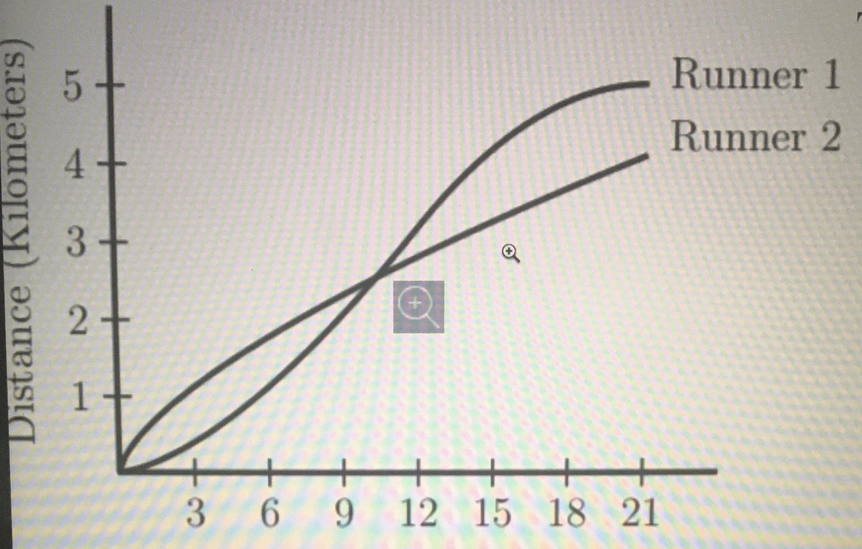 Curves on the graph show the distance covered by two runners during the first 21 minutes of a race.