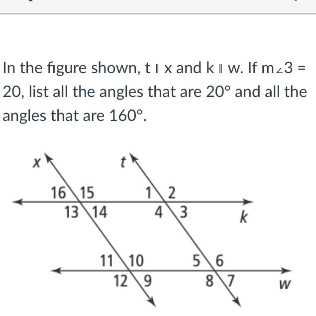 m∠1 = m∠5 = m∠16 = 20° [Corresponding angles]