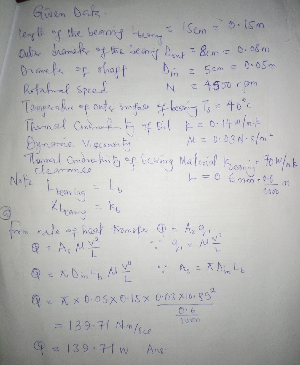 A 5-cm-diameter shaft rotates at 4500 rpm in a 15-cmlong, 8-cm-outer-diameter cast iron bearing (k = 70 W/m·K) with a uniform cl