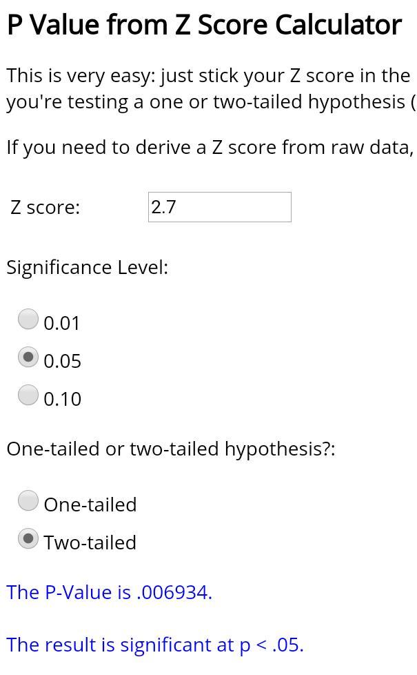 From online p-value calculator attached using z-value = 2.7; two tailed distribution; significance level = 0.05;