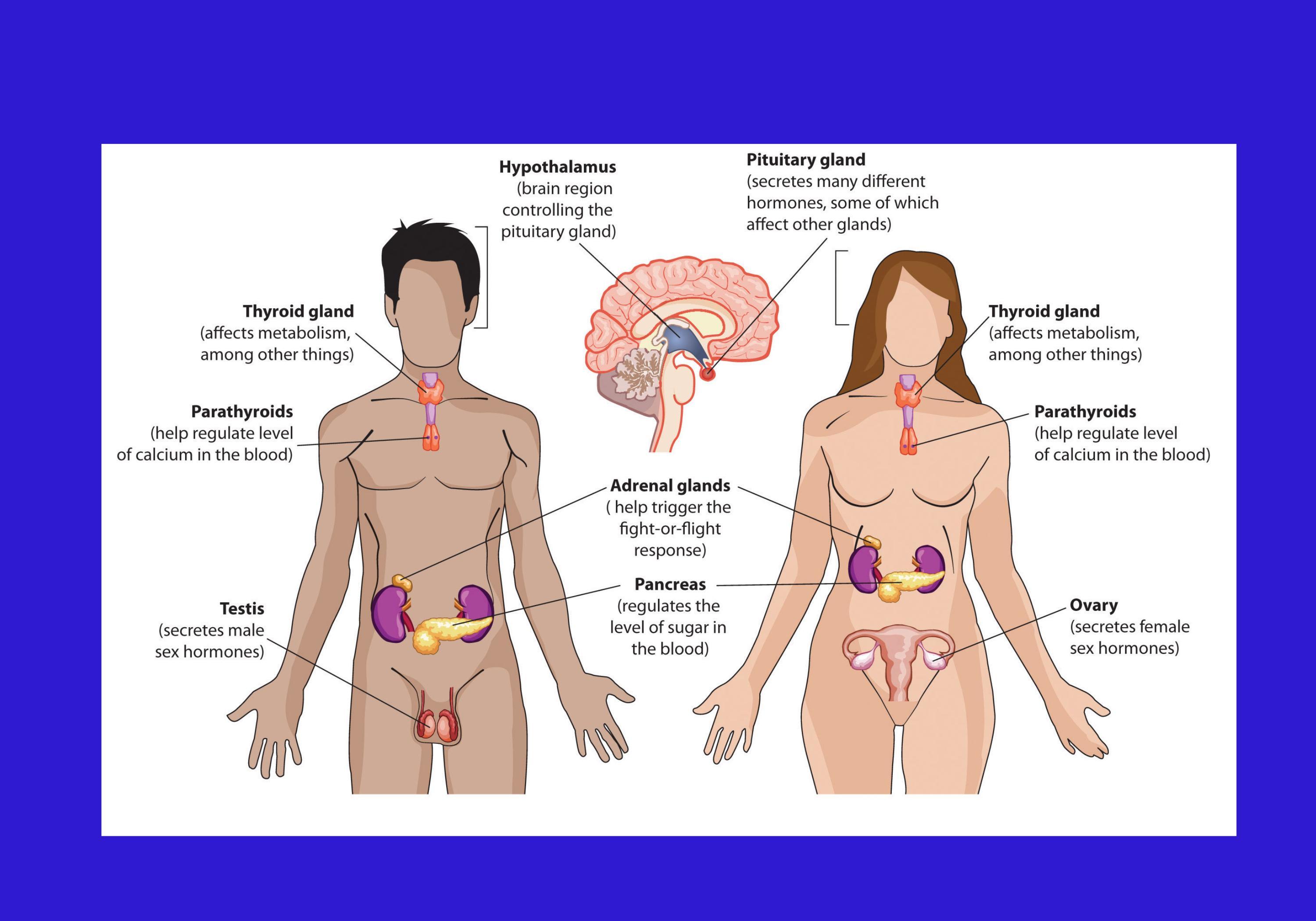 All the endocrine glands are: i) The hypothalamus that produces regulatory hormones such as Gonadotropin releasing hormone which stimulates the anterior pituitary hormone to produce other hormones and thyrotropin releasing hormone. ii) The pituitary gland separated into the anterior and posterior pituitary glands producing oxytocin, vasopressing, prolactin, lutenizing hormone, follicle stimulating hormone, adrenocorticotropin releasing hormone. iii) Thyroid glands that produce tetraiodothyronine and triiodothyronine. iv) Parathyroid gland producing the parathyroid hormone. v) Adrenal gland producing the hormones cortisol, aldosterone and testosterone. vi) Pancrease producing the hormones insulin and glucagon. vii) Testes (Leydig cells) producing the hormone testosterone. viii) Ovaries producing estrogen and progesterone.