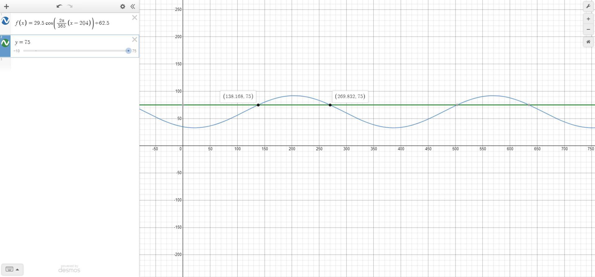 can be modeled by T (d) = 29.5 cosine (StartFraction 2 pi Over 365 EndFraction (d minus 204) ) + 62.5, where d represents the day number of the year (January 1 is 1, January 2 is 2, and so on). How many days during the year is the high temperature expected to be 75°F or above?