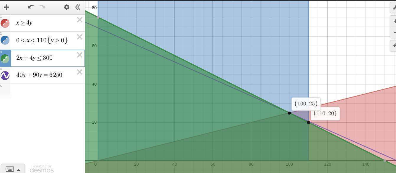 The objective function 40x+90y is maximized when the line is at the vertex of the feasible region that puts it farthest from the origin. That point is (x, y) = (100, 25). A close candidate is the point (x, y) = (110, 20), for which the profit is slightly less.
