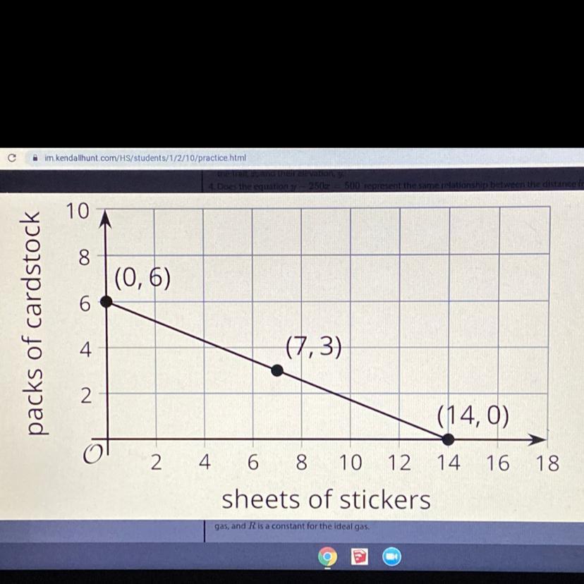 2). Vertical intercept (0, 6) represents that he can purchase maximum 6 packs of cardstock with $21.