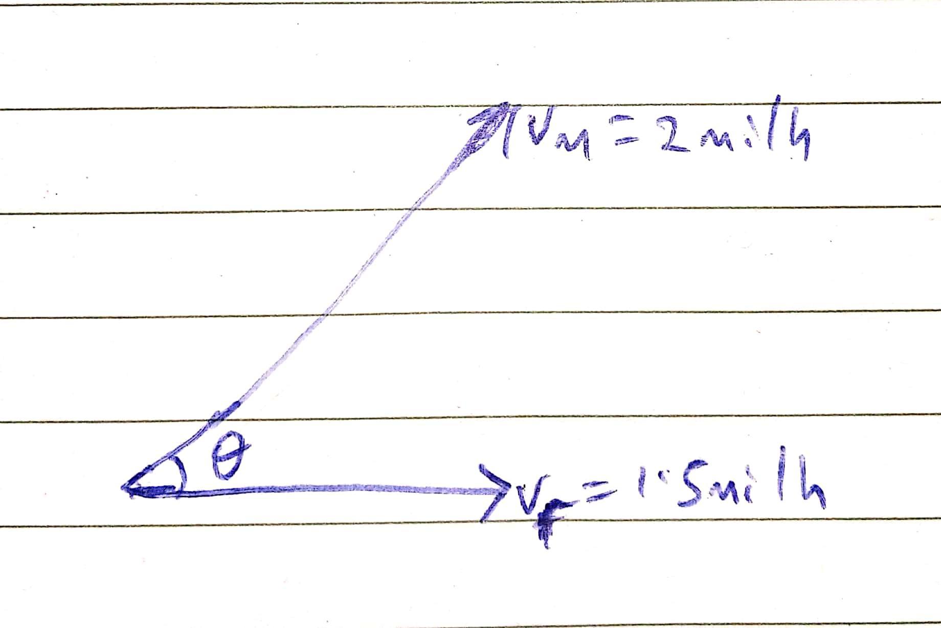 A on the opposite bank. If she wishes to minimize the total time T it would take to do so, at what angle upstreams (measured from the line AB) should she swim? Let her swimming/rowing speed relative to the water be 2.0 mi/h, and her running speed along the bank be 5 mi/h. The river flows downstream at 1.5 mi/h. (The rule of the competition stipulates that the athletes must swim first from point A, then run to reach point B.)
