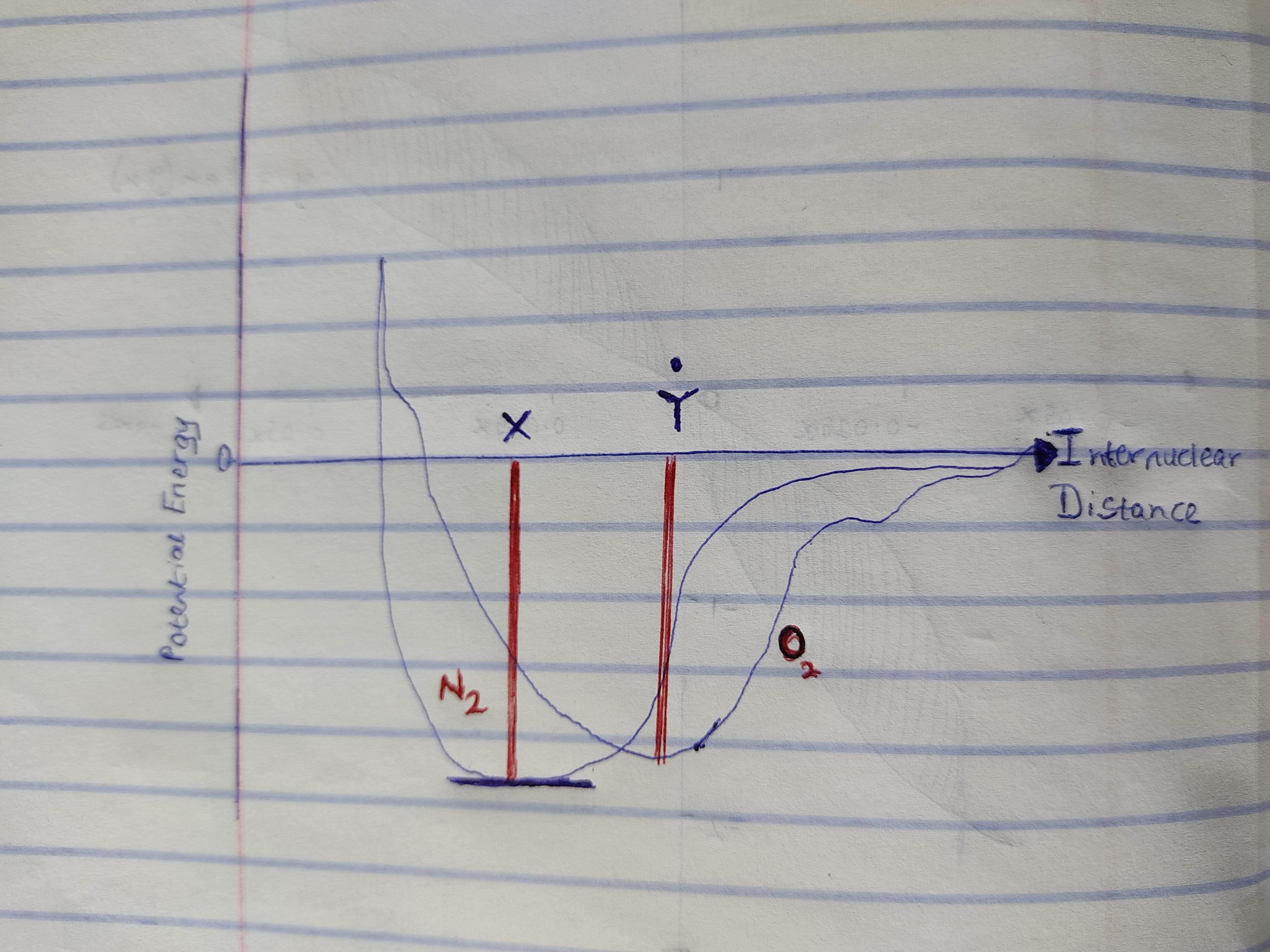 The bond length shows the distance of the bonds between the nuclei of the bonded atoms between the N2 molecule and O2 molecule. From the diagram, we can see that the bond length of O2 shows a greater tendency over the N2 molecule and it also have higher potential energy than the N2 molecule.