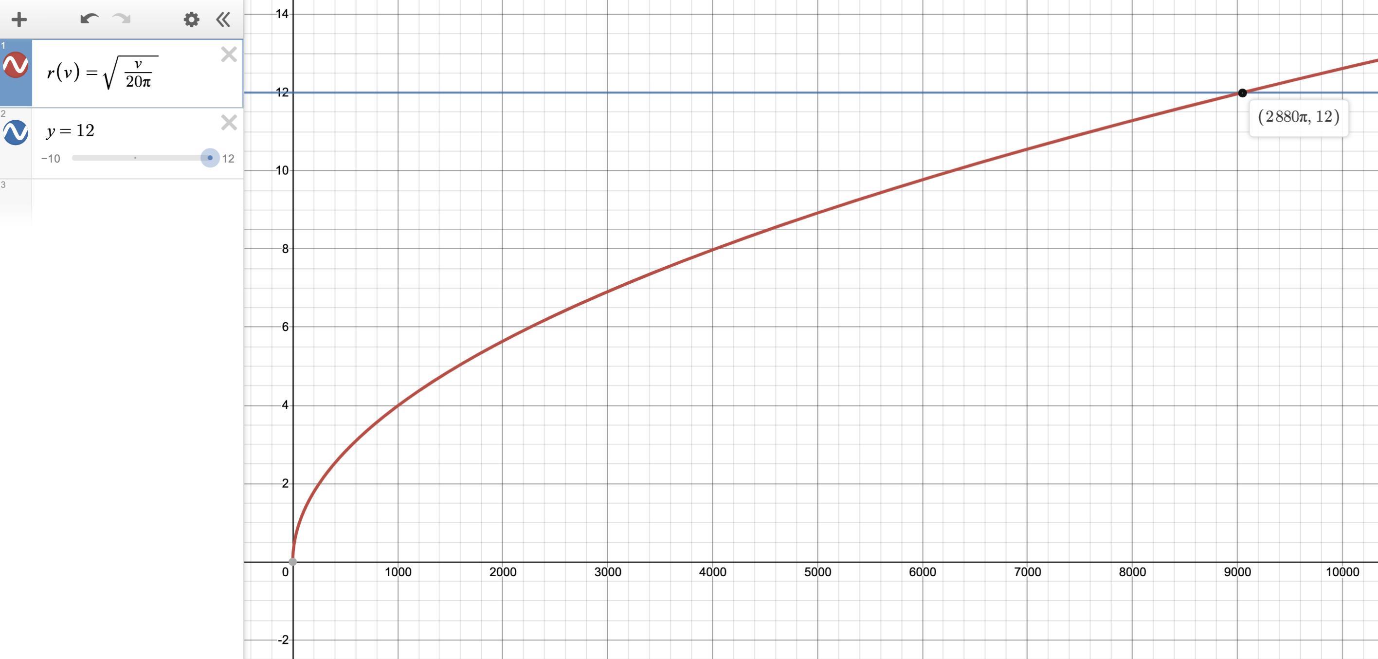 144(20π) = V . . . . . . square both sides; multiply by 20π