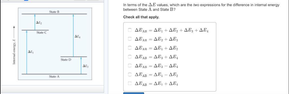 In terms of the δe values, which are the two expressions for the difference in internal energy between state a and state b? chec