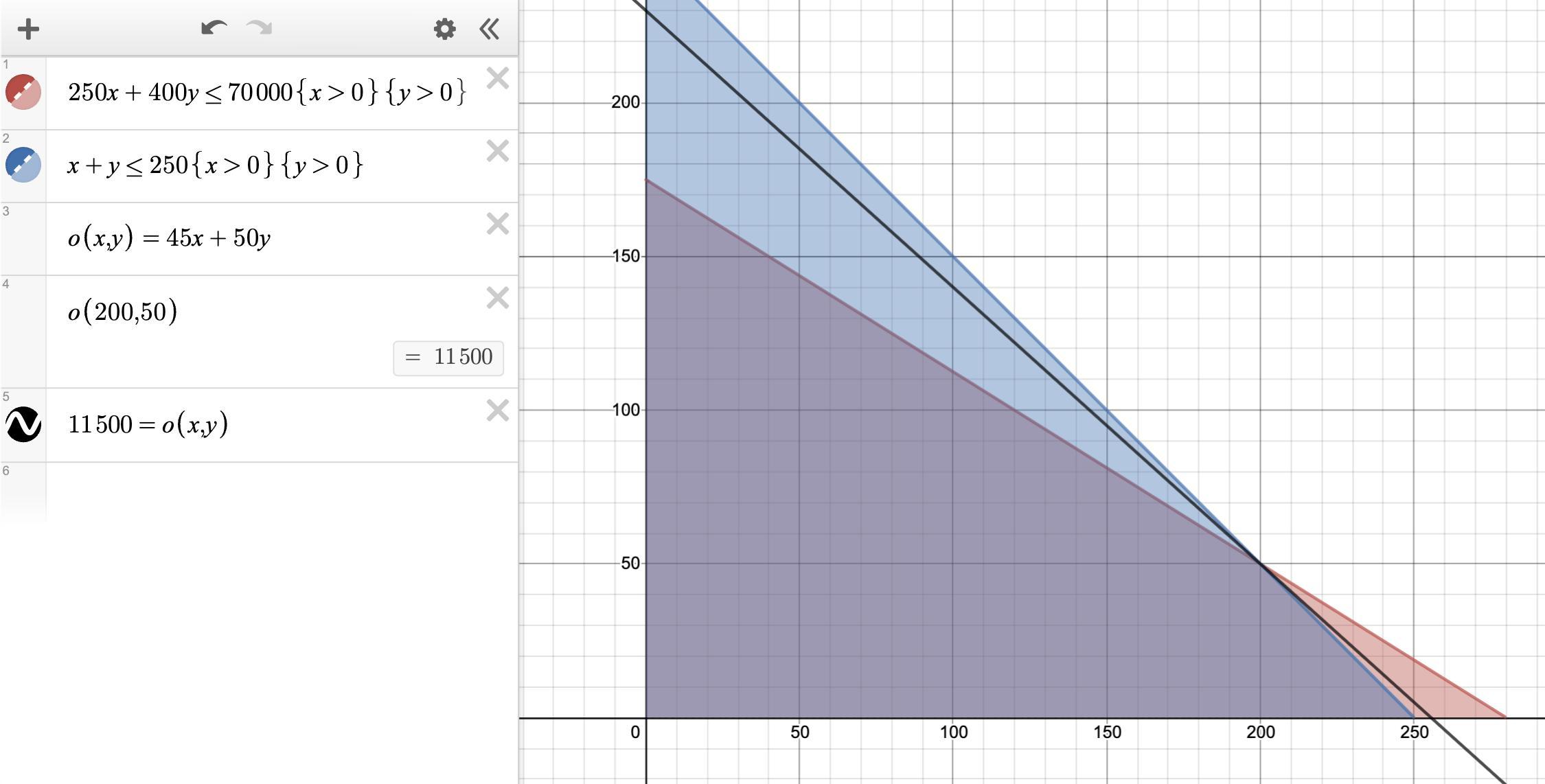 - Constraints: x + y ≤ 250; 250x +400y ≤ 70000; x ≥ 0; y ≥ 0