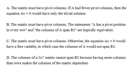 In the given question, If the column of 5 \times 7 matrix, and the A span is equal to R^5, and then the value of A has a pivot in each row, that's why in each pivot its position in the different columns of A has the five pivot columns, that's why the choice B is correct.