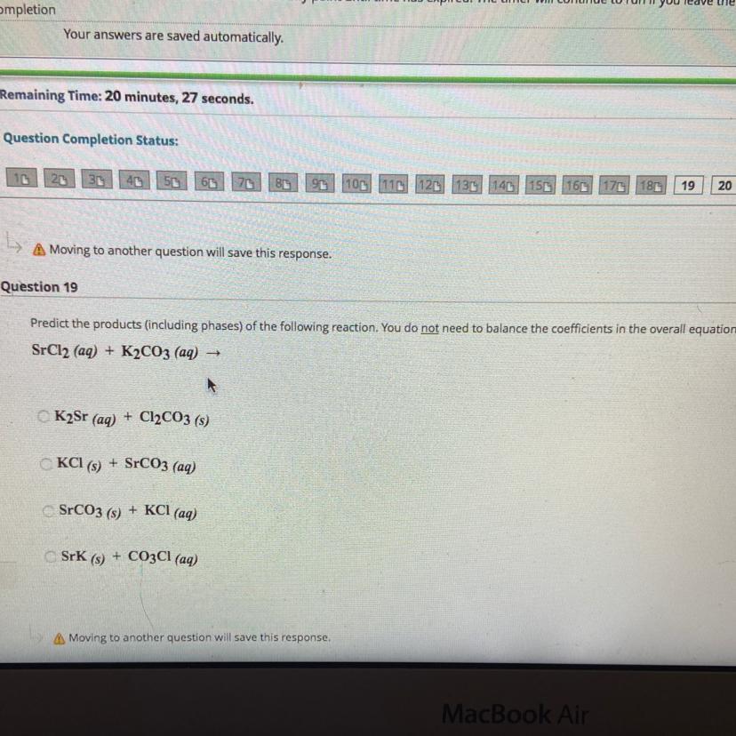 Answer: SrCl_2(aq)+K_2CO_3(aq)\rightarrow 2KCl(aq)+SrCO_3(s)
