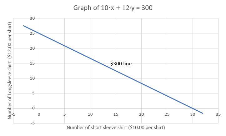 You have a budget of $300 for the shirts. The equation $10x+12y=300$ models the total cost, where $x$ is the number of short-sleeved shirts and $y$ is the number of long-sleeved shirts. a. Graph the equation. Interpret the intercepts