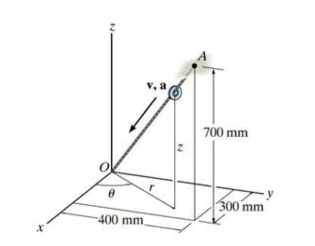 The small washer is sliding down the cord OA. When it is at the midpoint, its speed is 28 m/s and its acceleration is 7 m/s 2 .