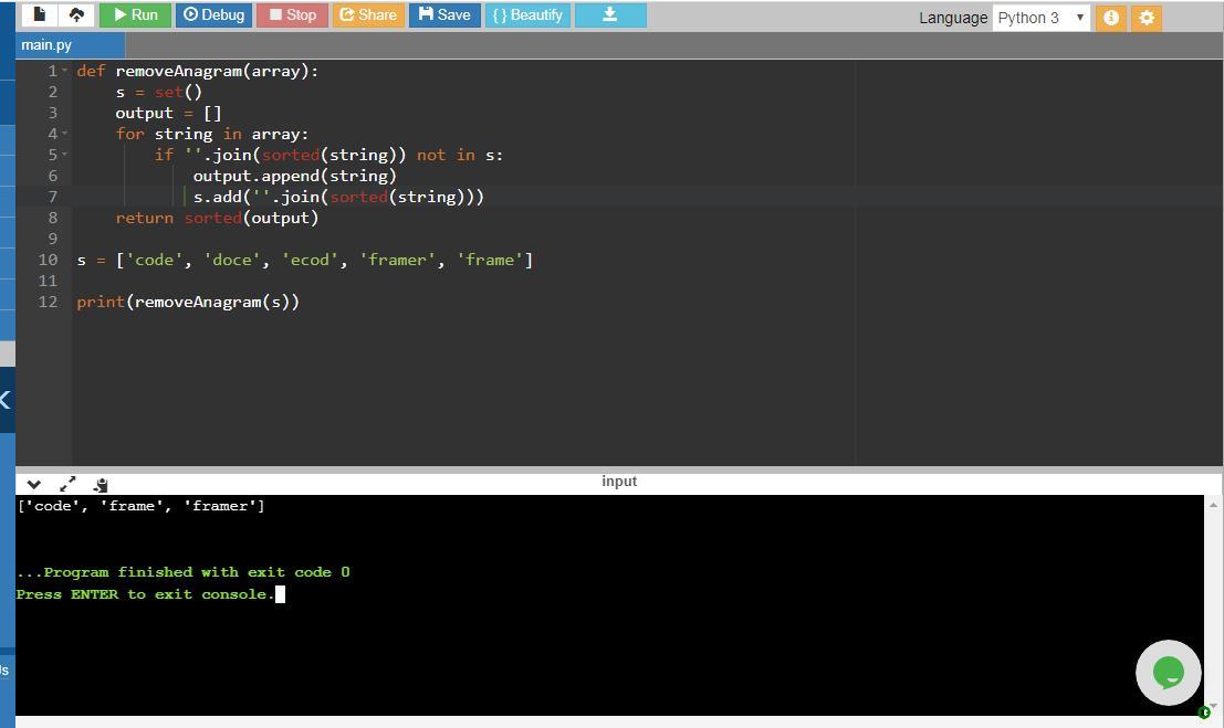print(removeAnagram(array)) #calls method to remove each string that is an anagram of earlier string