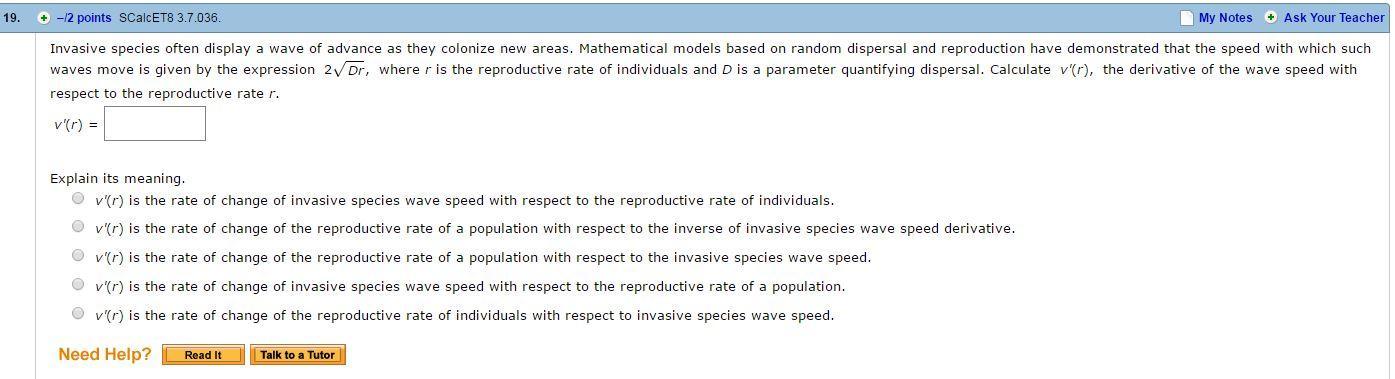 eproduction have demonstrated that the speed with which such waves move is given by the expression 2 Dr , where r is the reproductive rate of individuals and D is a parameter quantifying dispersal. Calculate v'(r), the derivative of the wave speed with respect to the reproductive rate r.