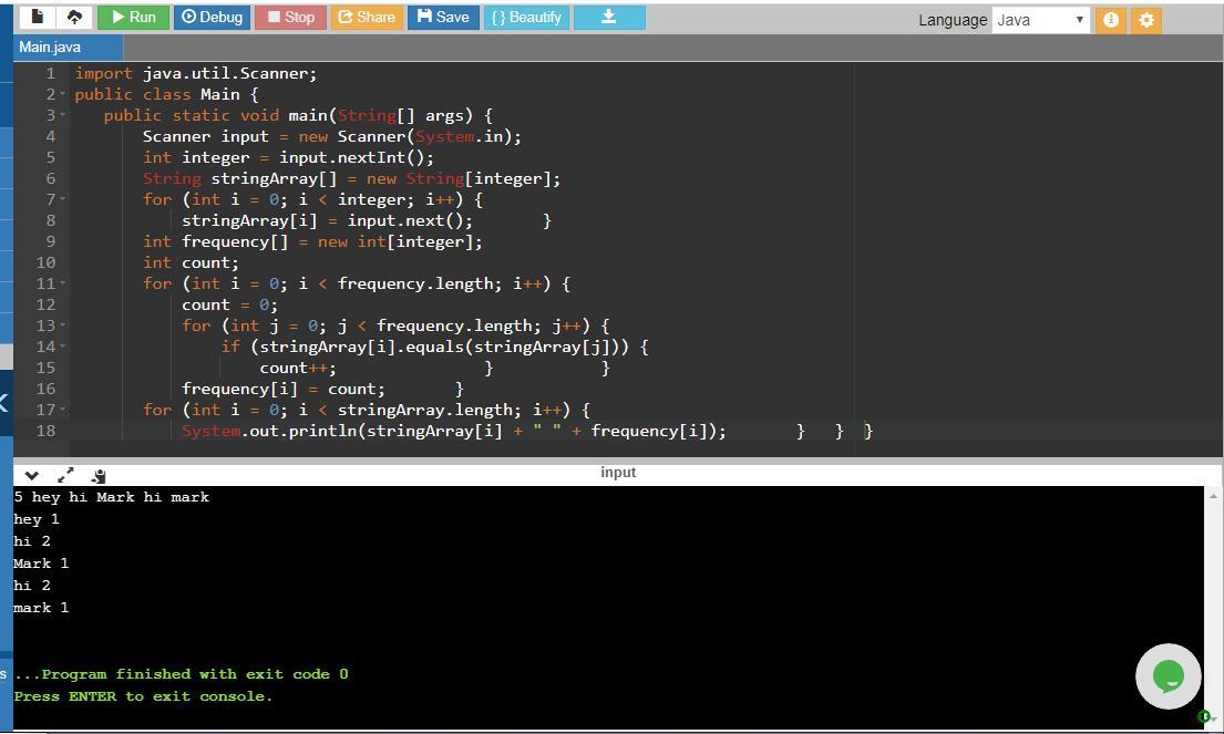 and inner loop for (int j = 0; j < frequency.length; j++) iterate through the array and if condition if (stringArray[i].equals(stringArray[j])) checks if any of the words at specified indices is equal. This is used in order to check if any word in the list comes more than once. So if any word occurs more than once in the array, then its count is increased each time and the count value is stored in frequency[] array to store the count/frequency of each word in the stringArray. Since hey occurs once so its count is set to 1 and hi occurs twice so its frequency is set to 2. So the output of the entire program is:
